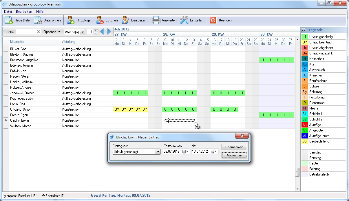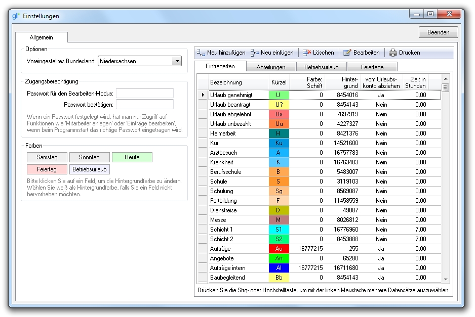 Beliebig viele Abwesenheitsarten mit freier Kürzel- und Farbwahl